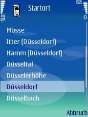 Nachdem Sie alle Eingaben (s.o.) erledigt und ggf. die Herstellung einer Internetverbindung bestätigt haben, wird eine Anfrage an das Auskunftssystem des aktivierten Verkehrsunternehmens gestellt. Wenn Ihre Angaben zu Startort, Starthaltestelle, Zielort und/oder Zielhaltestelle nicht zur eindeutigen Identifizierung Ihres Fahrtwunsches geführt hat, werden Sie nun nacheinander zur Präzisierung der einzelnen Parameter aufgefordert , und zwar in der Reihenfolge