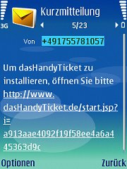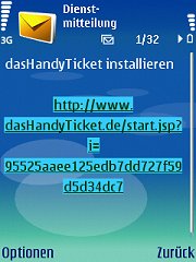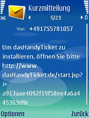 SMS-Speicher: Bitte sehen Sie unter Mitteilungen/Eingang nach, ob eine SMS vorliegt, die "HandyTicket Deutschland installieren" heisst! Als Absender ist "HandyTicket" angegeben. Öffnen Sie diese!