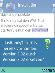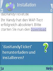 Ein solches Java-Programm wird in der Regel "over the air (OTA)", also über eine Funkstrecke, installiert. Dazu öffnet man mit dem WAP-Browser des Handys eine Internet-Adresse, unter der das Programm zur Abholung bereitliegt. Ihr Handy weiß selbst, dass es sich um ein Programm handelt und wie es installiert wird.
