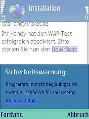 Ihr Handy muss in der Lage sein, eine WAP-Seite darzustellen. Dazu benutzt es den im Handy bei der Herstellung installierten WAP-Browser. Wenn Ihr Handy nicht über diese Funktion verfügt (meist unter "Dienste"), kann es das Programm nicht laden.