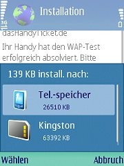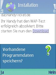 Die Frage nach dem Download müssen Sie mit "Ja" beantworten. Die letzten drei Fragen erscheinen nur, wenn Sie entweder die Anwendung bereits installiert hatten und/oder eine externe Speicherkarte im Handy haben.